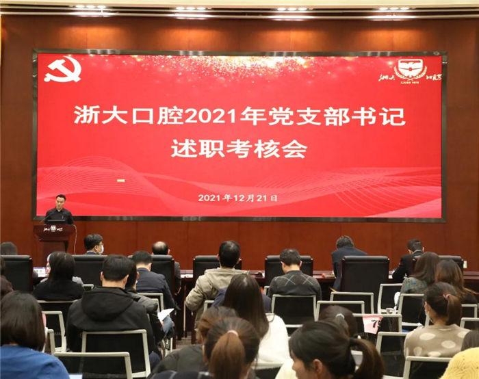 为深入学习贯彻习近平总书记关于基层党建重要论述精神,深入贯彻新时代党的建设总要求和党的组织路线,贯彻落实全省基层党建工作精神和学校“对标争先”建设计划,以党建和事业互融互促为重点,全面提升基层党建工作质量,12月21日晚,浙大口腔在华家池总院举行2021年度党支部书记述职考核评议会。党政领导班子、党支部书记、中层干部等150余人参加会议。