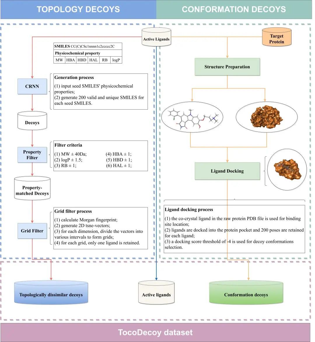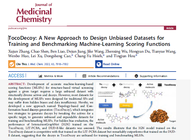 2022年6月,浙江大学药学院侯廷军教授团队、中南大学曹东升教授团队和腾讯量子实验室联合在《Journal of Medicinal Chemistry》上发表论文“TocoDecoy: A New Approach to Design Unbiased Datasets for Training and Benchmarking Machine-Learning Scoring Functions”,提出了一种用于机器学习打分函数训练和测试的无偏数据集构建新方法。该方法引入四种技巧来消除隐藏偏差,给定特定靶标的活性分子,基于条件分子生成和分子对接,可以基于已知的活性分子高效地生成相应的负样本(decoys),为机器学习打分函数的训练和测评提供了无偏的数据集。