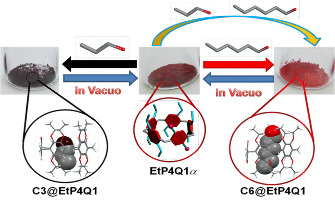 将基于柱[4]醌[1]芳烃的非多孔自适应晶体用作挥发性脂肪醛(如正丙醛和正己醛)的新型吸附剂和可视化的气致变色检测器,同时展现出优异的检测效率和选择性。