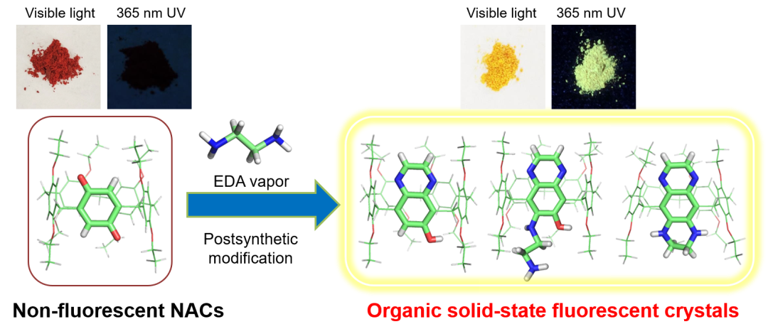 利用多步串联的气-固相反应,将合成后修饰引入到非多孔自适应晶体中以用于制备有机固态荧光材料,并实现乙二胺与其它脂肪胺蒸汽的选择性检测。