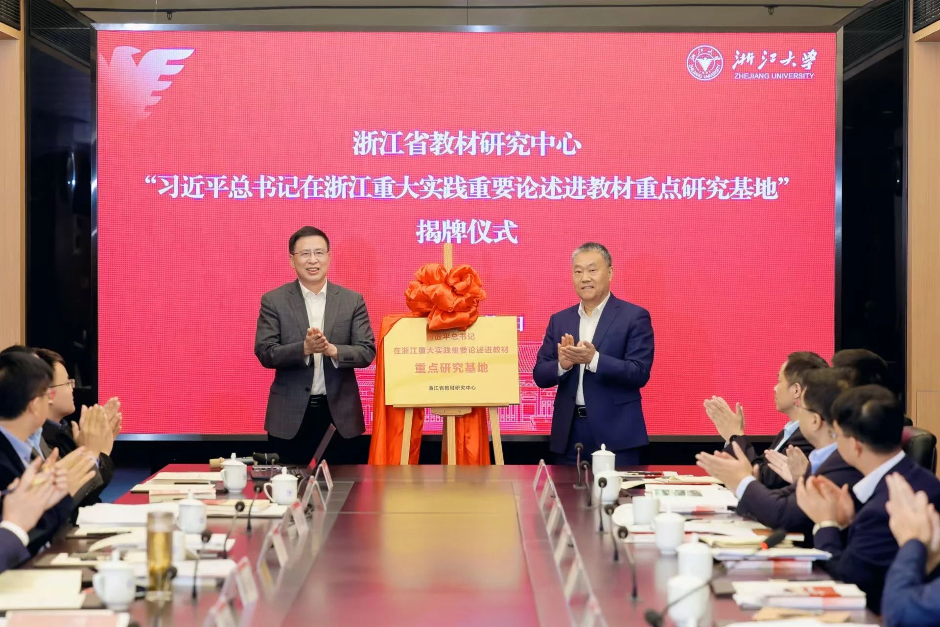 会上,浙江省教材研究中心“习近平总书记在浙江重大实践重要论述进教材重点研究基地”正式成立,校党委副书记朱世强和马克思主义学院负责人为基地揭牌。