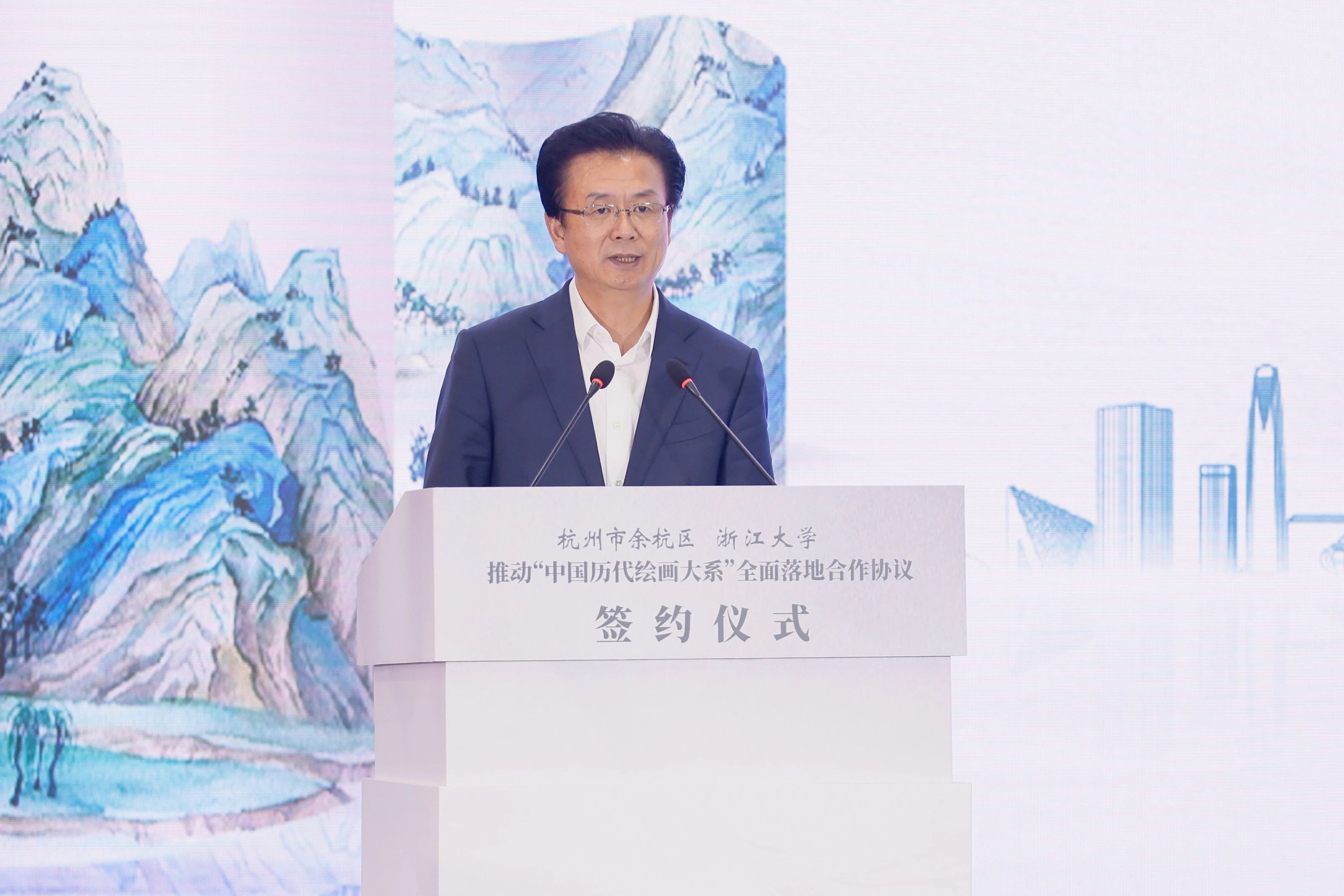杭州市委常委、余杭区委书记刘颖致辞。浙江省委宣传部副部长、省新闻出版局局长虞汉胤,杭州市委常委、宣传部部长黄海峰,杭州良渚遗址管理区党工委书记、管委会主任王姝出席。浙江大学副校长黄先海,余杭区委常委、宣传部部长倪伟俊代表双方签约。浙江大学党委副书记朱慧、余杭区委副书记、区长王牮为“中国历代绘画大系”保护研究中心揭牌。