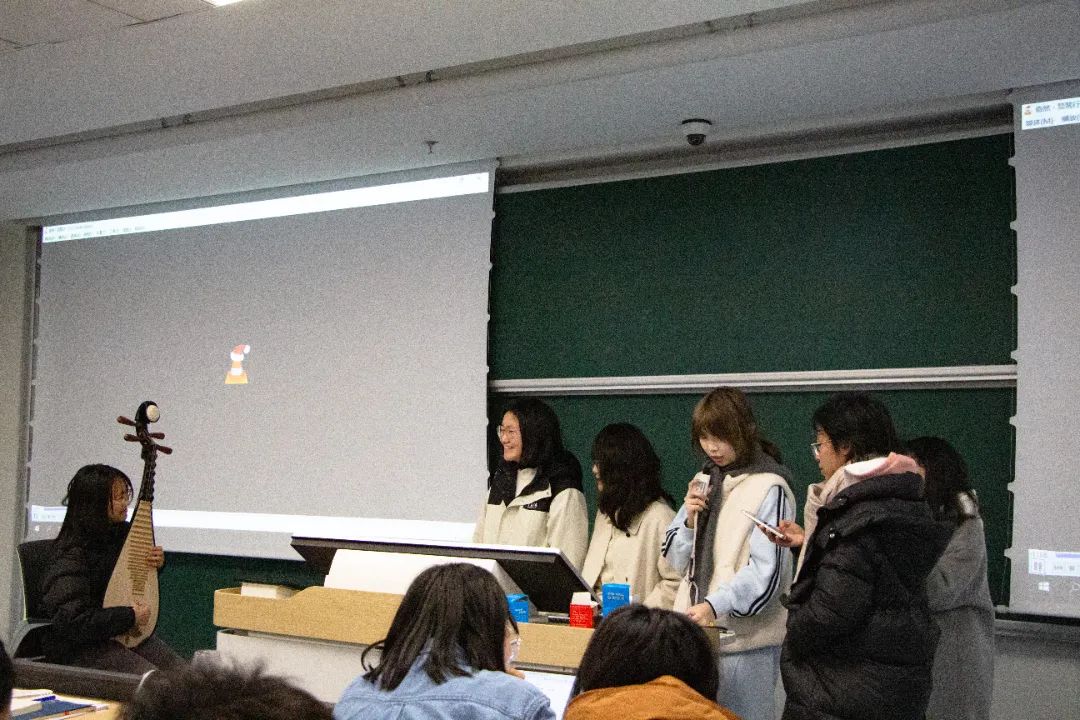 表演结束后,同学们仍意犹未尽。如“青浪饮素雪”小组,下了极大功夫,编写了原创剧本,可惜时间有限,没能全部展示。他们说,希望来年还能来到赏读课的课堂,给未尽的表演画上完美句号。《古汉语与古诗文赏读》上的学生展示