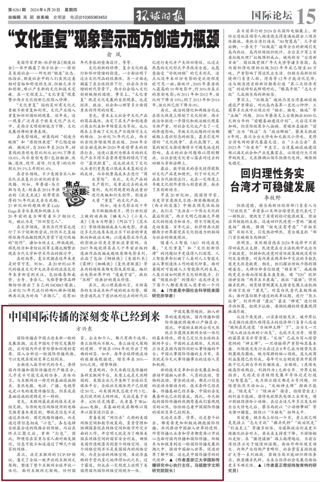 2024年6月20日的《环球时报》发表浙江大学国际传播研究中心执行主任方兴东教授的文章《中国国际传播的深刻变革已经到来》。