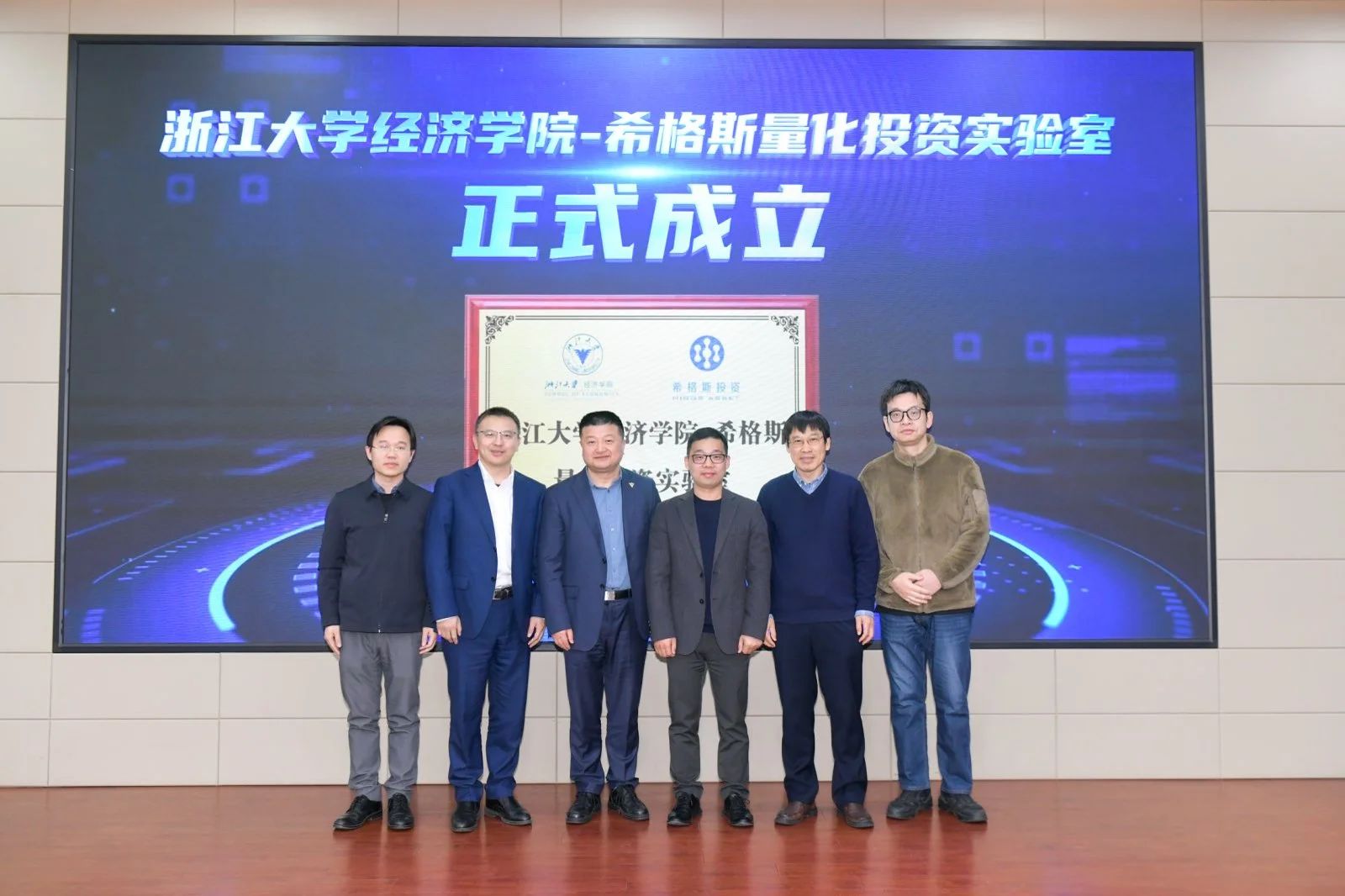 在希格斯教育基金的支持下,浙江大学经济学院与杭州希格斯投资管理有限公司将联合成立“浙江大学经济学院-希格斯量化投资实验室”。在实验室成立仪式上,谈效俊与浙江大学青山讲席教授陈松年、浙江大学教育基金会副秘书长陈振华、经济学院专聘副院长张川川、长聘副教授曾涛共同为实验室揭牌。